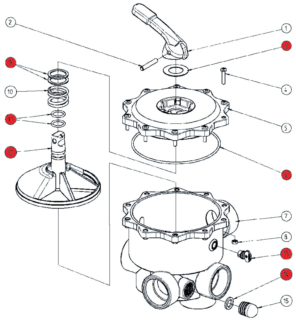 Dichtsatz für Praher 6-Wege-Ventil 2" Ocean V6 neue Version (Sterndichtung am Stempel/Teller fix montiert) als Ersatzteil-Paket bestehend aus: