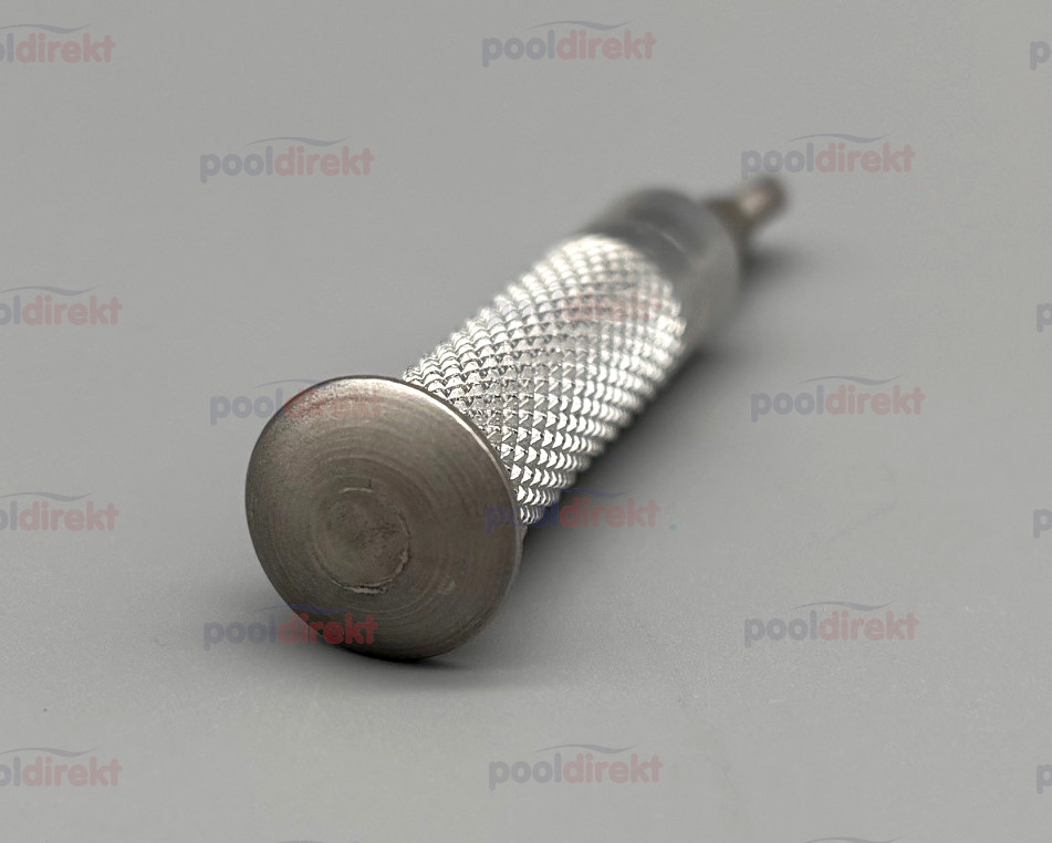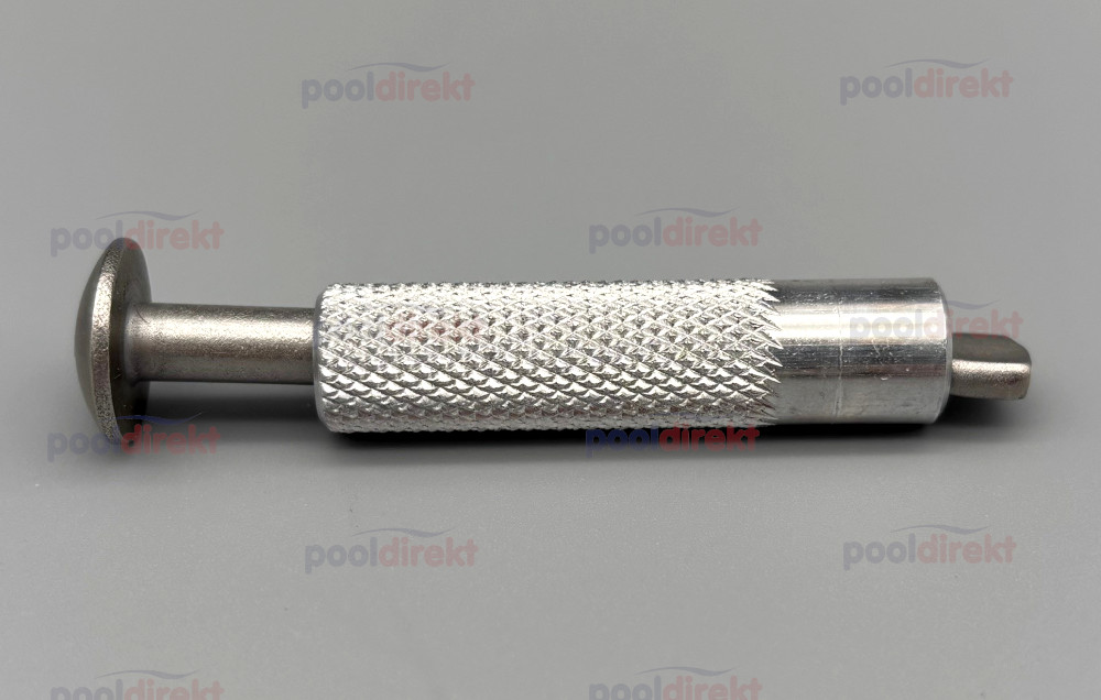Herausziehbarer Edelstahl-Stift mit Hülse, als versenkbarer Bodenanker zur Befestigung von Poolabdeckungen an der Pool-Umrandung.