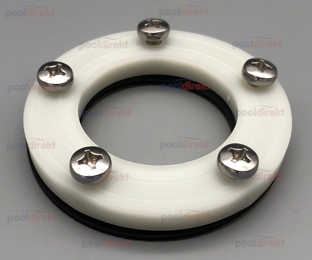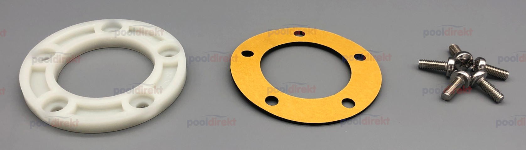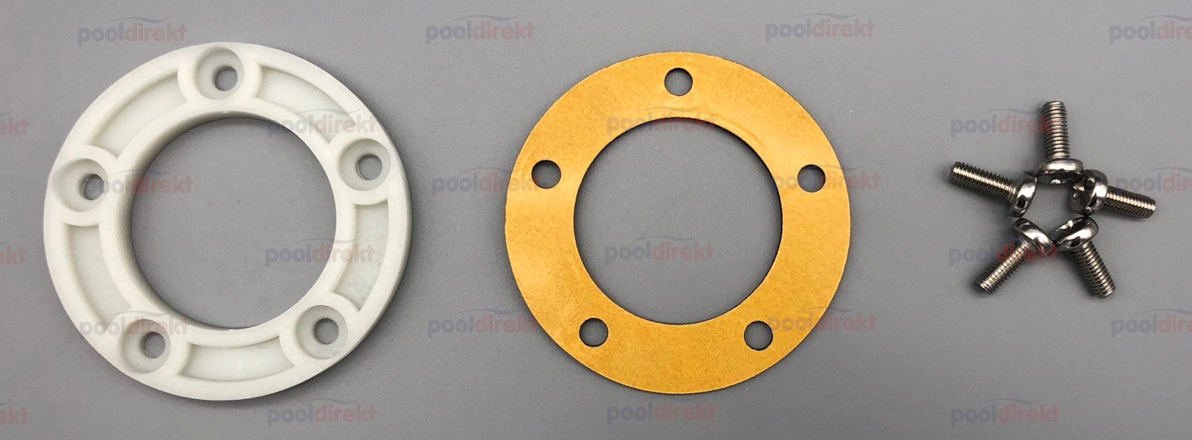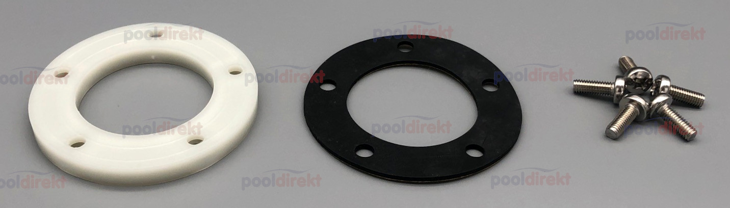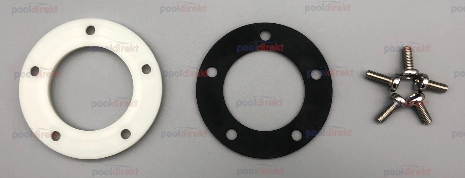 Set aus Gummidichtung zum Aufkleben auf die Mauerdurchführung vor Folierung des Beckens, Flansch zum Abdichten nach Folierung des Beckens und 5 Schrauben (passend zu Mauerdurchführung, siehe Zubehör).