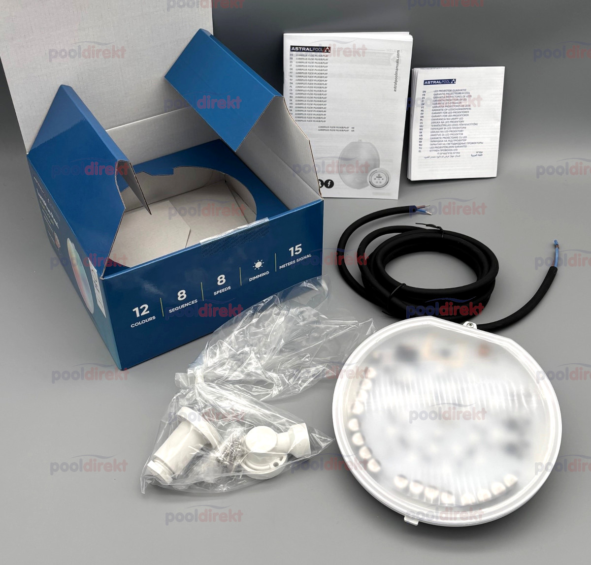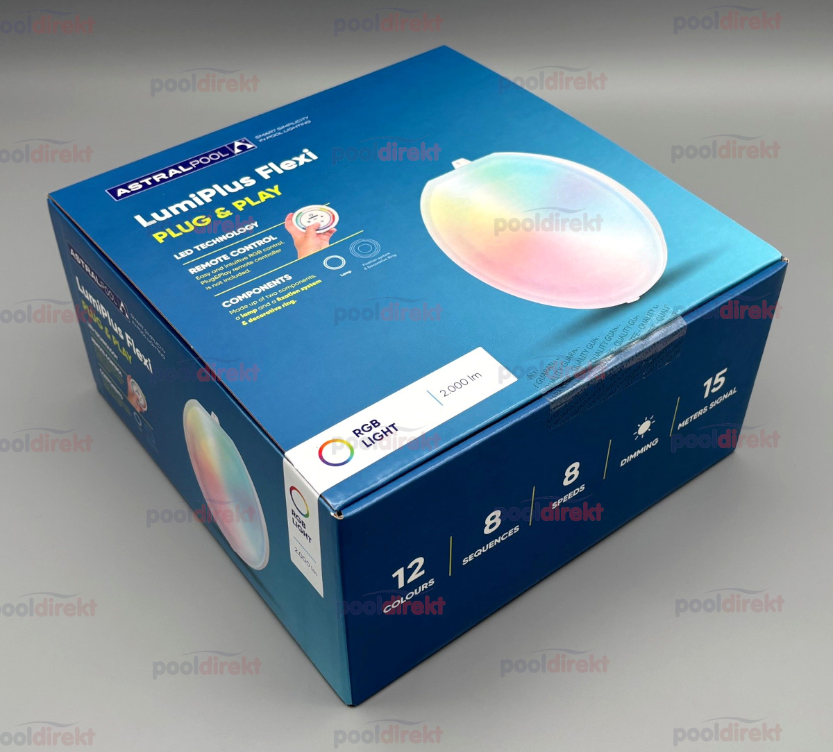 LumiPlus Flexi Plug&Play LED Leuchtmittel mit 2,5 m Kabel mehrfarbig RGB (AC 12V, 34,5W, 2.000 Lumen) zum Befestigen in der Blende - ideal für Sanierungen (ab 2025). Wählen Sie eine Blende dazu, einschrauben - fertig. Mit der LumiPlus Plug&Play Fernbedienung können Sie Ihre Poolbeleuchtung steuern (Farbe, Helligkeit, Farbwechselprogramme) - siehe Zubehör. Mit Nische, Kabelschutzschlauch und Blende haben Sie einen kompletten Scheinwerfer. ACHTUNG - dieses Leuchtmittel lässt sich NUR mit der Plug&Play Fernbedienung steuern (nicht enthalten), nicht über das Connect-Modul, nicht mit anderen Astral Fernbedienungen! Demonstrationsvideo (YouTube):