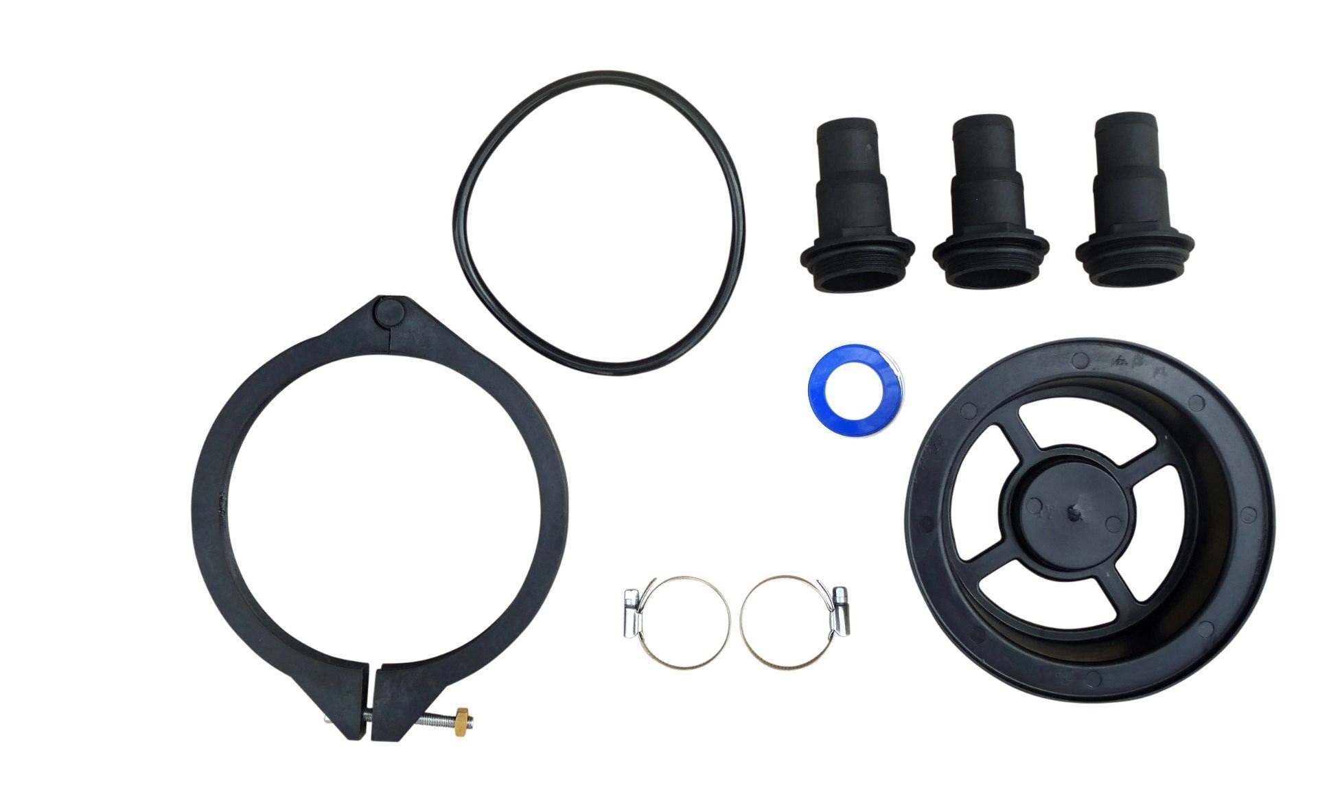 - Das Ventil wird mit drei Schlauchtüllen 32/38 mm zum Einschrauben (1 1/2" IG), Spannring und O-Ring, sowie Manometer geliefert