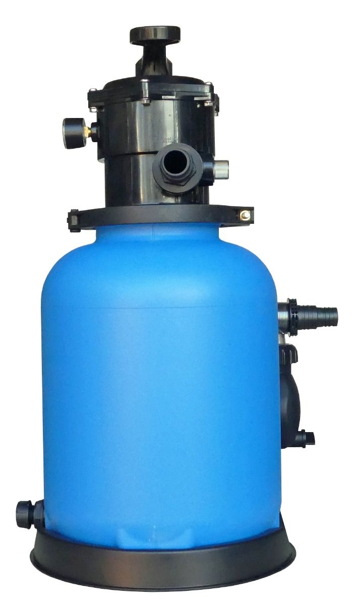 Grundplatte, Filterbehälter, Pumpe, 6-Wege-Topmount Ventil, Manometer, Schlauch zur Pumpe Ø 38 mm mit 2 Schellen 32 – 50 mm, Standrohr mit Düse bzw. Filterkreuz und Entleerung.