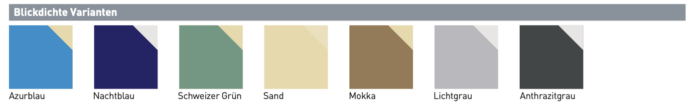 • Bitte wählen Sie aus 7 verschiedenen Farben: Azurblau - Nachtblau - Schweizer Grün - Sand - Mokka - Lichtgrau - Anthrazitgrau (Um eine Entfärbung auf den Randsteinen zu vermeiden sind die Rückseiten der blickdichten Abdeckungen in Farbe Sand oder Grau)