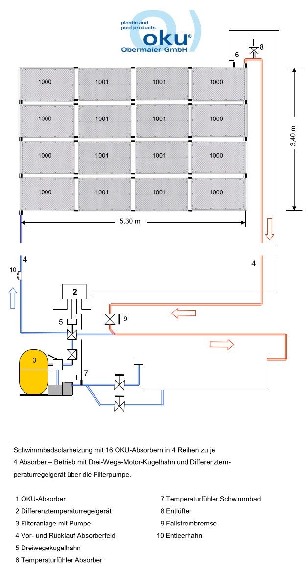 • Wir empfehlen bei Pools mit Poolabdeckung ca. 50 % der Beckenoberfläche als Absorber Oberfläche.
