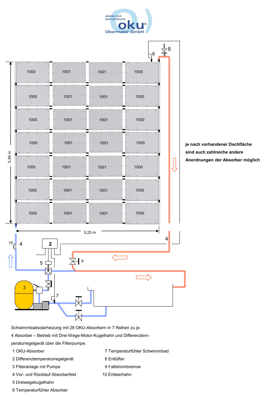 - Bei Pools ohne Abdeckung empfehlen wir ca. 75 % der Beckenoberfläche als Absorber Oberfläche.