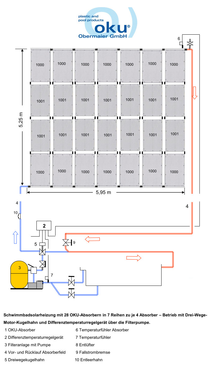 OKU® Schwimmbadsolarheizungen sind äußerst effizient, günstig in der Anschaffung und können in der Regel mit der vorhandenen Poolpumpe der Sandfilteranlage betrieben werden. Dies bedeutet, dass in solchen Fällen keine weiteren Stromkosten anfallen und mit den Solarkollektoren Ihr Pool umweltfreundlich beheizt wird.