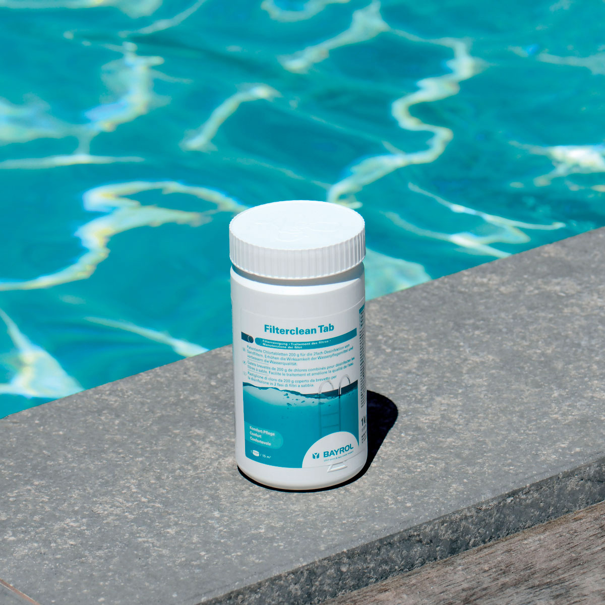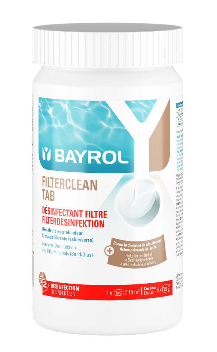 Die Filterclean-Tablette zerfällt nach ca. 10 Minuten und teilt sich in zwei Komponenten auf: Die erste Komponente führt eine kurze Stoßchlorung des Filters durch. Die zweite Komponente besteht aus langsamlöslichem Chlorgranulat, welches sich auf dem Filterbett des Sandfilters absetzt, und innerhalb von ca. 30 Minuten das Filtermaterial intensiv desinfiziert. Damit werden Schmutz „kalt verbrannt“ und Bakterien abgetötet und können bei der nächsten Rückspülung zuverlässig entfernt werden. Eine regelmäßige Filterdesinfektion unterstützt die Wirksamkeit der Pflegemittel wesentlich, da sie nicht bereits schon im Filter aufgezehrt werden, sondern den Pool gelangen und dort wirken können, wo die Wasserdesinfektion