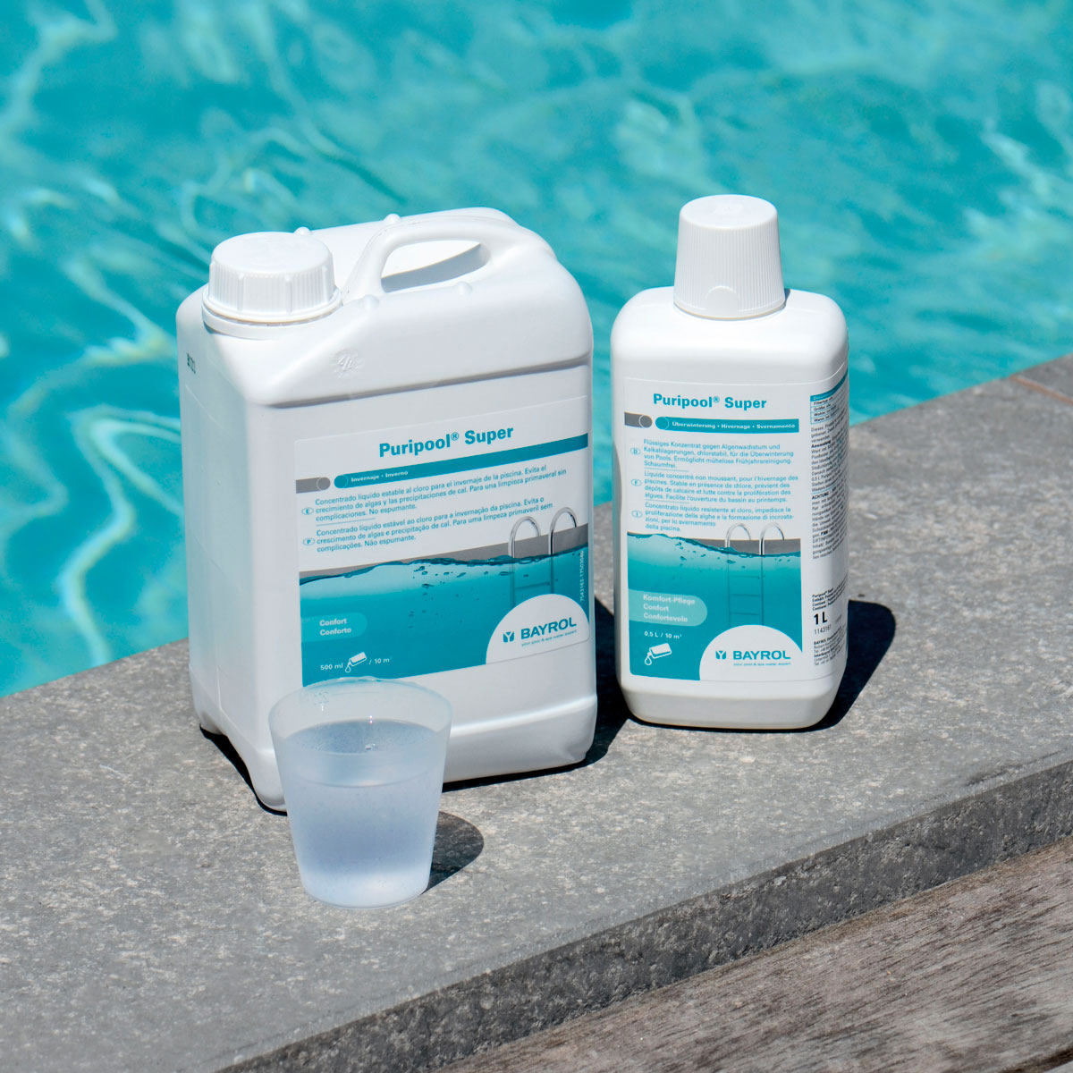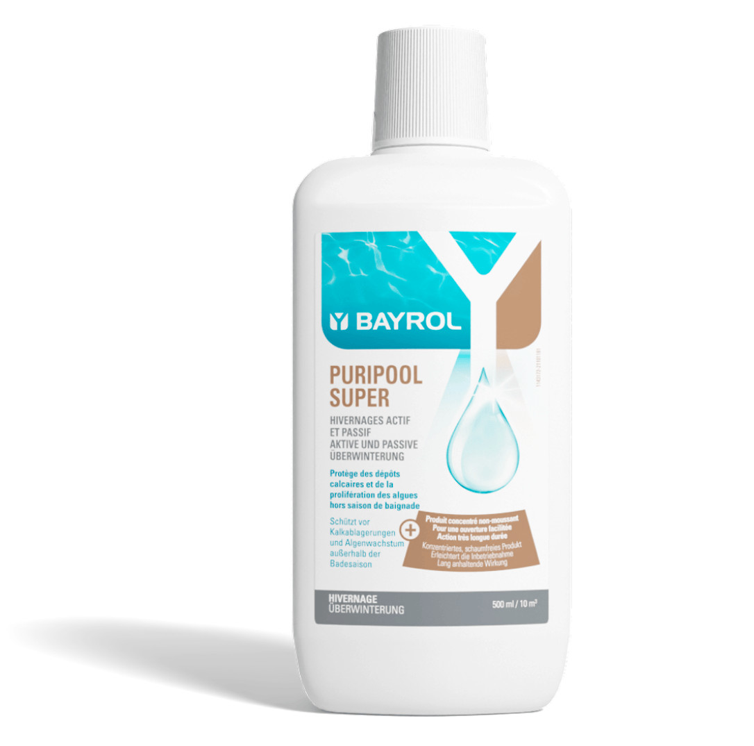 Puripool® Super ist eine chlorstabile, schaumfreie Flüssigkeit für die Verhinderung von Algenwachstum, Kalk- und sonstigen Schmutzablagerungen im Pool während der Überwinterung. Dadurch wird die Frühjahrsreinigung wesentlich erleichert.
