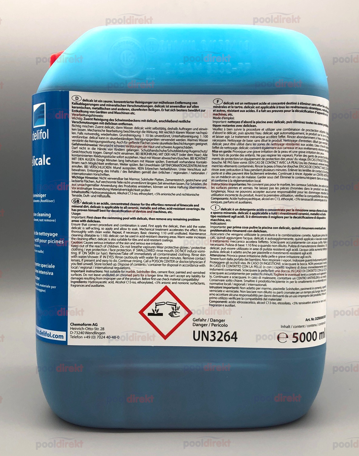 Delicalc ist ein Intensivreiniger für Frei- und Hallenbäder. Entfernt Kalkstein und Sedimentablagerungen, starke Rostansätze sowie allgemeinen Schmutz. Selbst hartnäckige Kalkverkrustungen werden aufgelöst. Mineralsäuregemisch mit Keimstopp und Korrosionsschutz.