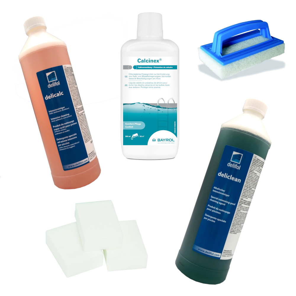 1 Liter Deliclean, 1 Liter Delicalc, 1 Liter Calcinex, 3 Reinigungsschwämme und 1 Handschrubber.