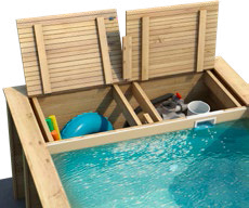 Die Massivholzpools Pool’n Box sind unter dem Handlauf mit einer geräumigen Box zur Aufbewahrung von automatischen Reinigern, Schwimm-Zubehör und Wasserspielzeug versehen - damit nichts mehr herumliegt und die Poolumgebung immer sauber und einladend wirkt. Und so ganz nebenbei haben die Massivholzpools Pool’n Box auch noch einen äußerst attraktiven Preis.