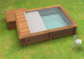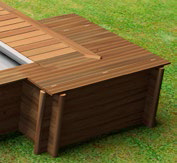 Dieser Anbau zur Unterbringung der Schwimmbad-Technik besteht aus 28 mm dicken Holzbohlen. Die Klappe hat das gleiche Profil wie die Beckenumrandung des Pools; sie ist - gemäss der Sicherheitsnorm NF P 90-308 - mit Scharnieren versehen und abschliessbar. Der Technikraum- Anbau wird in einer Ecke des Pools angebracht und beherbergt die elektrischen Komponenten der automatischen Abdeckung sowie die Filtration. Bei ganz oder teilweise eingelassenen Becken ist ein Technikraum-Anbau unbedingt erforderlich.