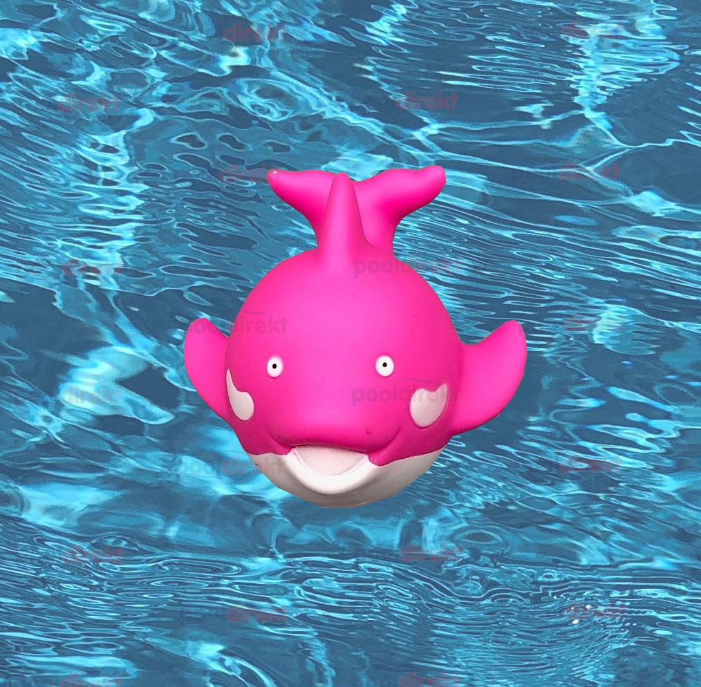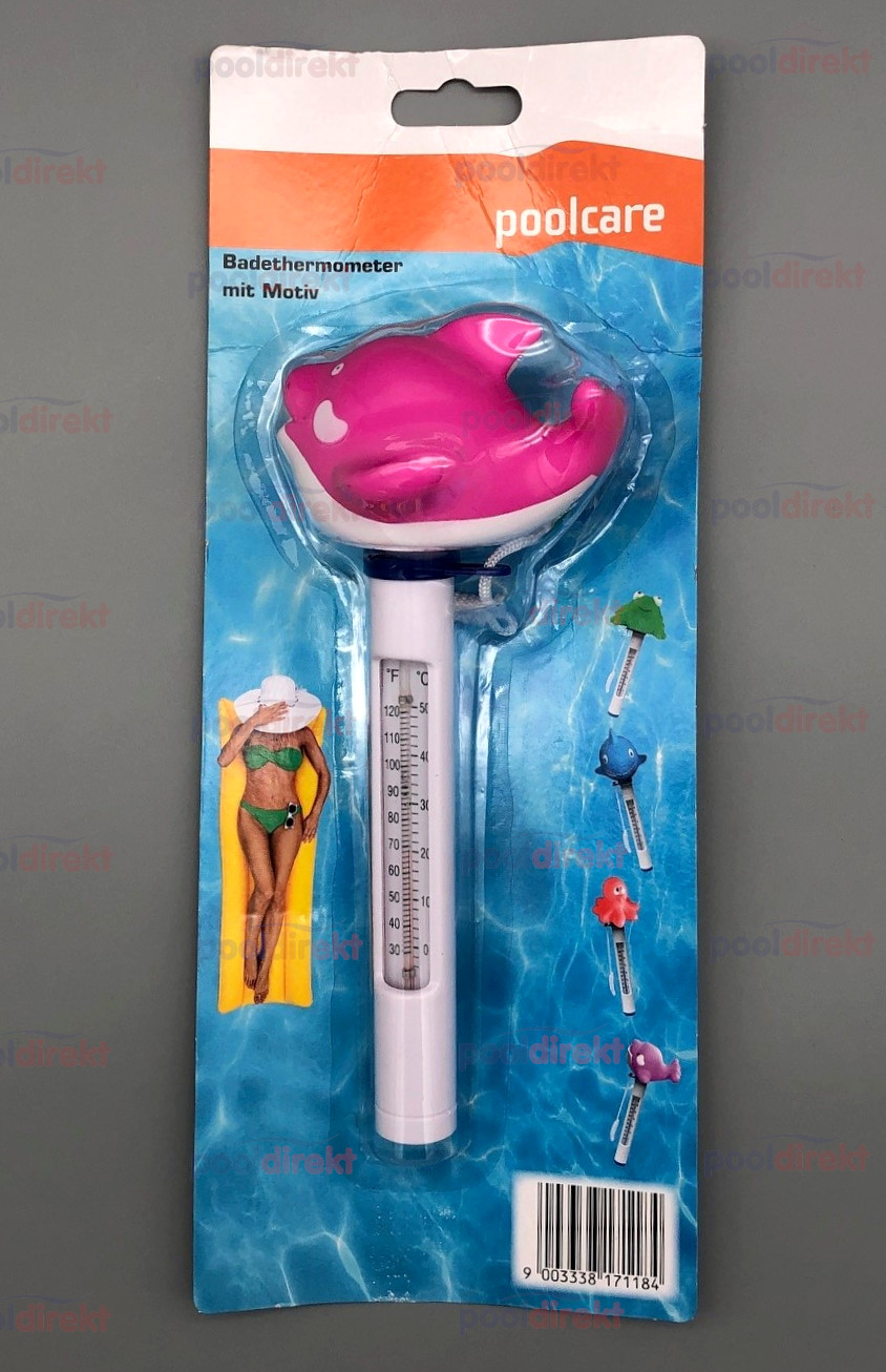 Pool-Thermometer mit Wal in rosa als Schwimmboje. Thermometerskala in °C und °F. Inkl. Kordel zur Befestigung.