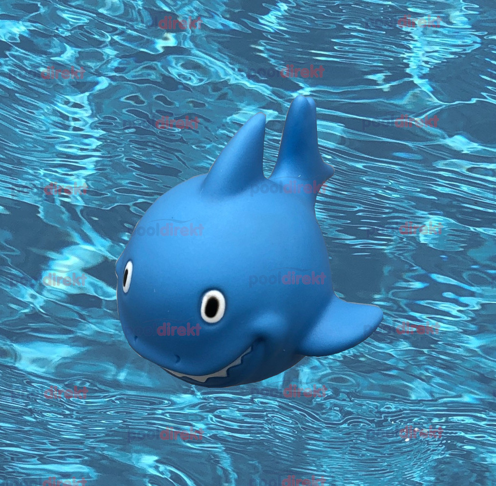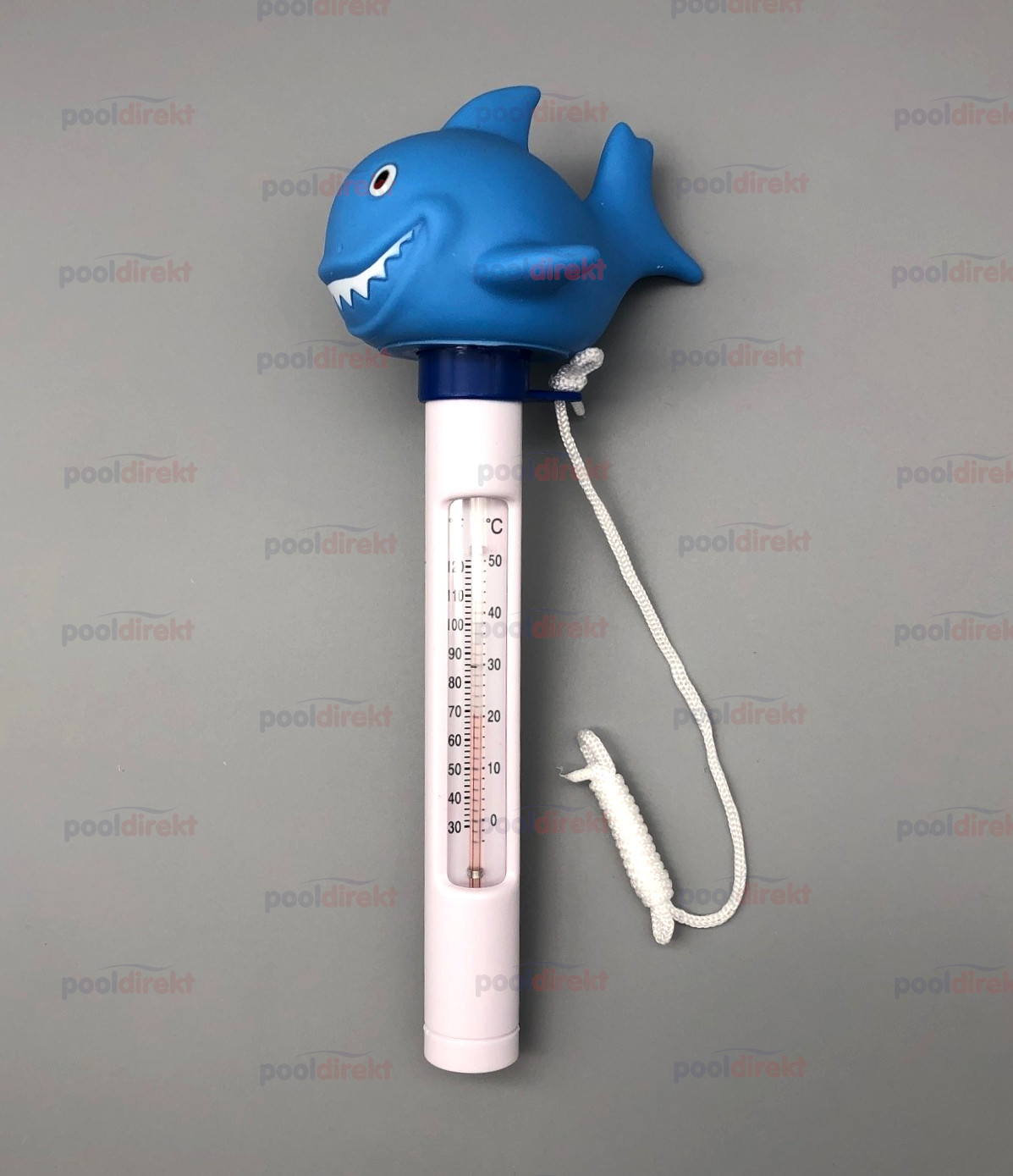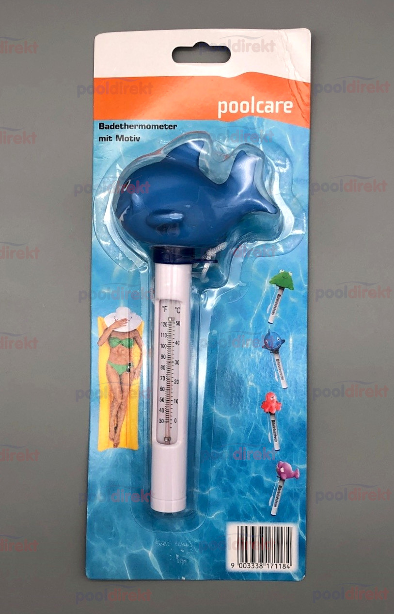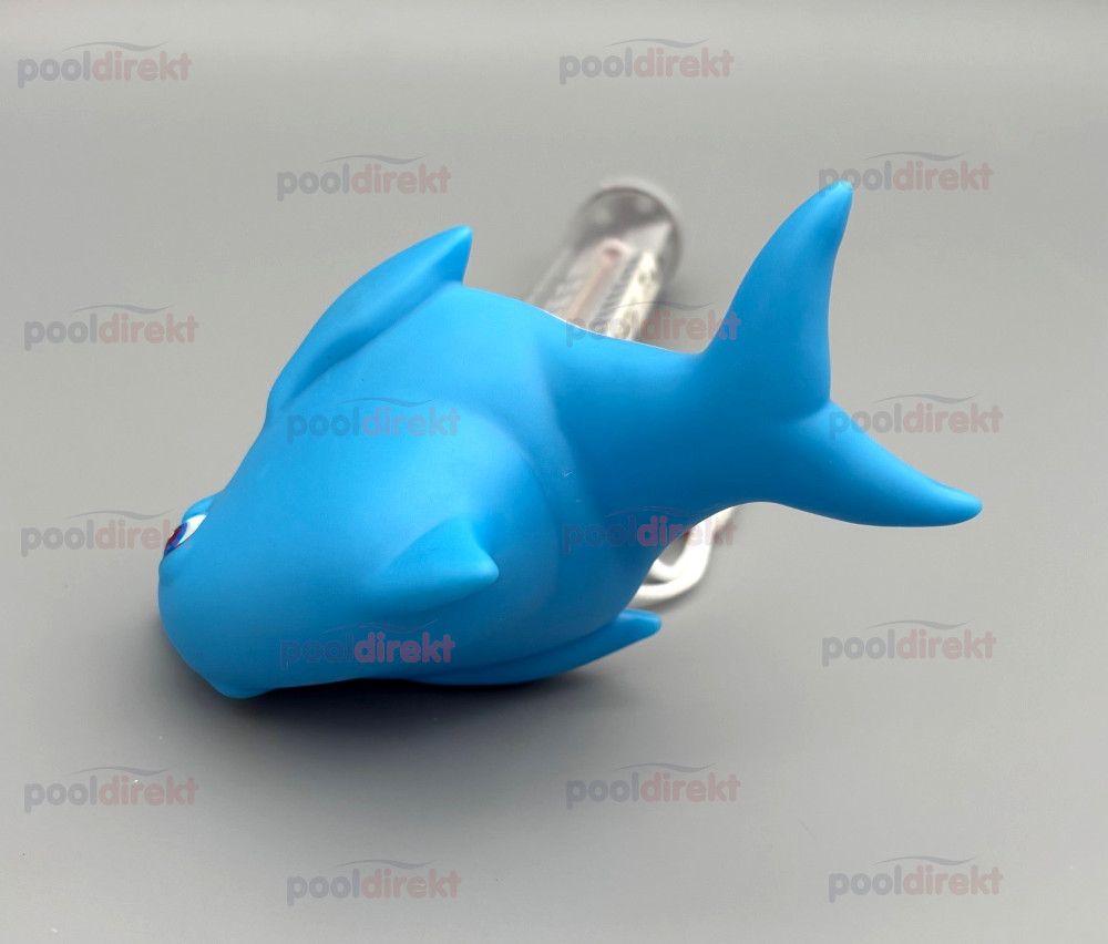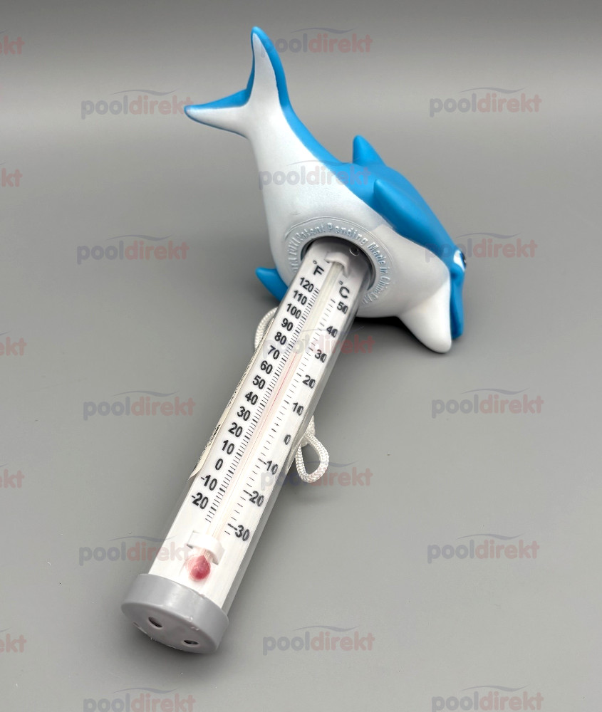 Pool-Thermometer mit Delfin in blau als Schwimmboje. Thermometerskala in °C und °F. Inkl. Kordel zur Befestigung.