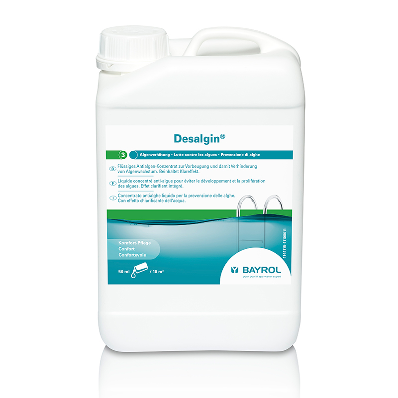 Desalgin CLASSIC ist ein konzentriertes Algizid und verhindert sicher das Wachstum und die Ausbreitung von Algen im Poolwasser. Der beinhaltete Klareffekt sorgt für ein noch brillanteres Wasser. Desalgin® CLASSIC ist eine reine Vorbeugung gegen Algenwachstum, bei Algenbefall empfiehlt sich eine Stoßchlorung mit Desalgin® SHOCK oder einem anderen BAYROL Produkt für die Schockchlorung.