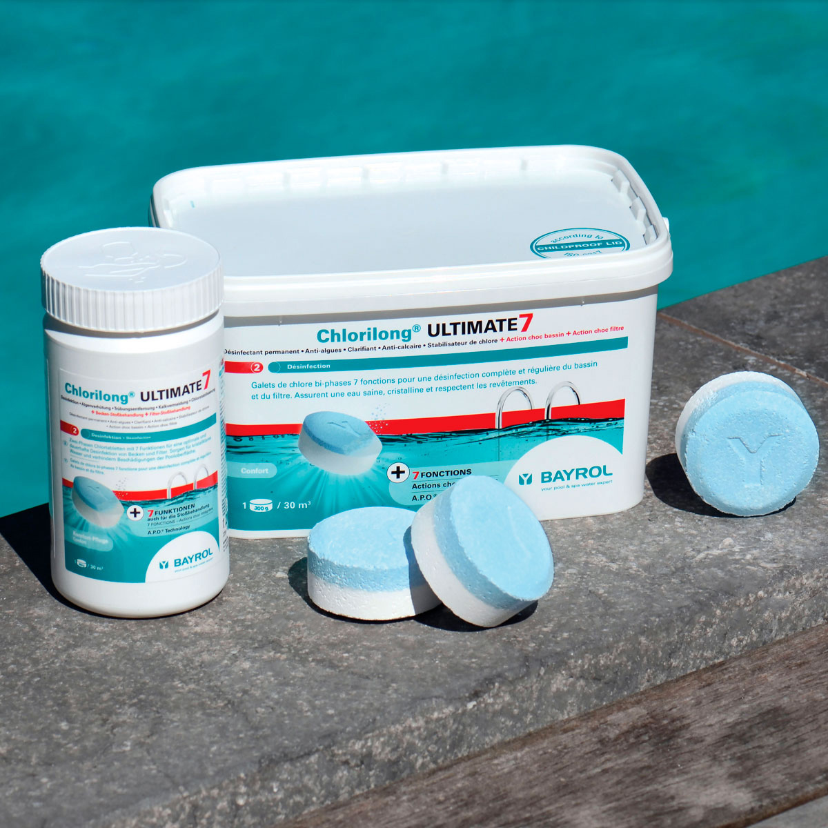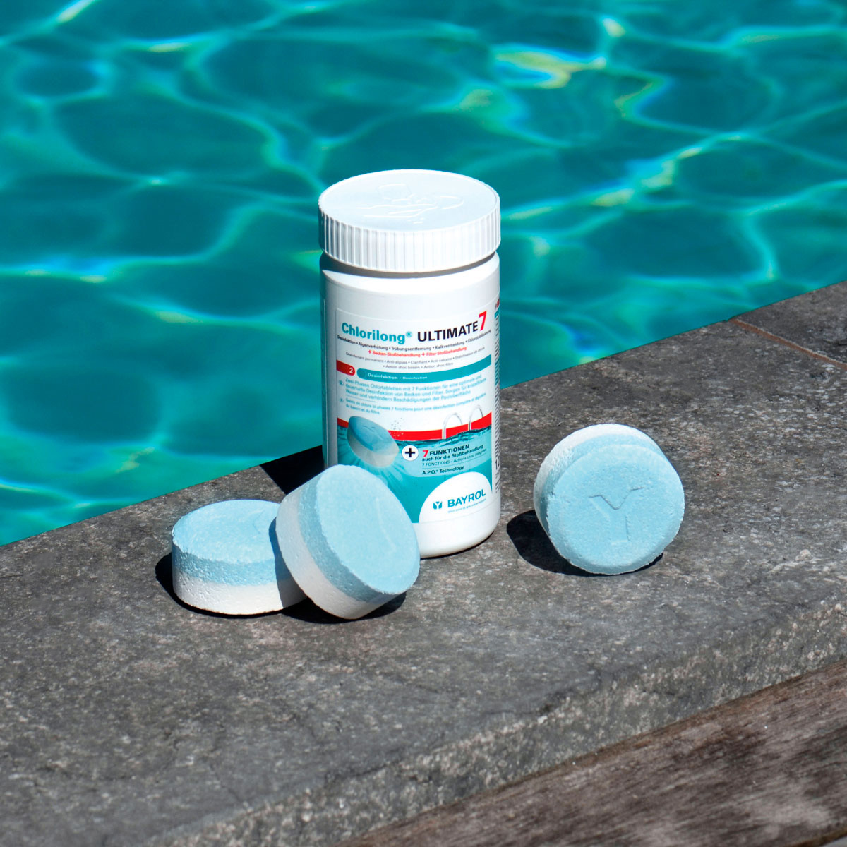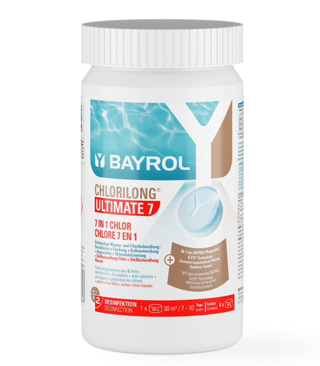Chlorilong® ULTIMATE7 ist eine 7 Funktionen (Desinfektion • Algenverhütung • Trübungsentfernung • Kalkvermeidung • Chlorstabilisierung + Becken– + Filter-Stoßbehandlung) -Chlortablette (300 g) bestehend aus zwei Phasen mit unterschiedlichen Wirkungsweisen: Der blaue Teil zerfällt in etwa 10 Minuten und lagert sich auf dem Filterbett des Sandfilters ab. Dies bewirkt eine Intensivreinigung und Desinfektion des Filtermaterials. Schmutz und Bakterien werden dadurch sicher entfernt. Der weiße Teil der Tablette ist langsamlöslich und sorgt für eine Dauerdesinfektion. Dank dieser einzigartigen Rezeptur, zusammen mit dem enthaltenen Trübungsentferner, Chlor- und Härtestabilisator bietet die Chlorilong® ULTIMATE7 eine ultimative Wasserpflege für kristallklares Wasser.
