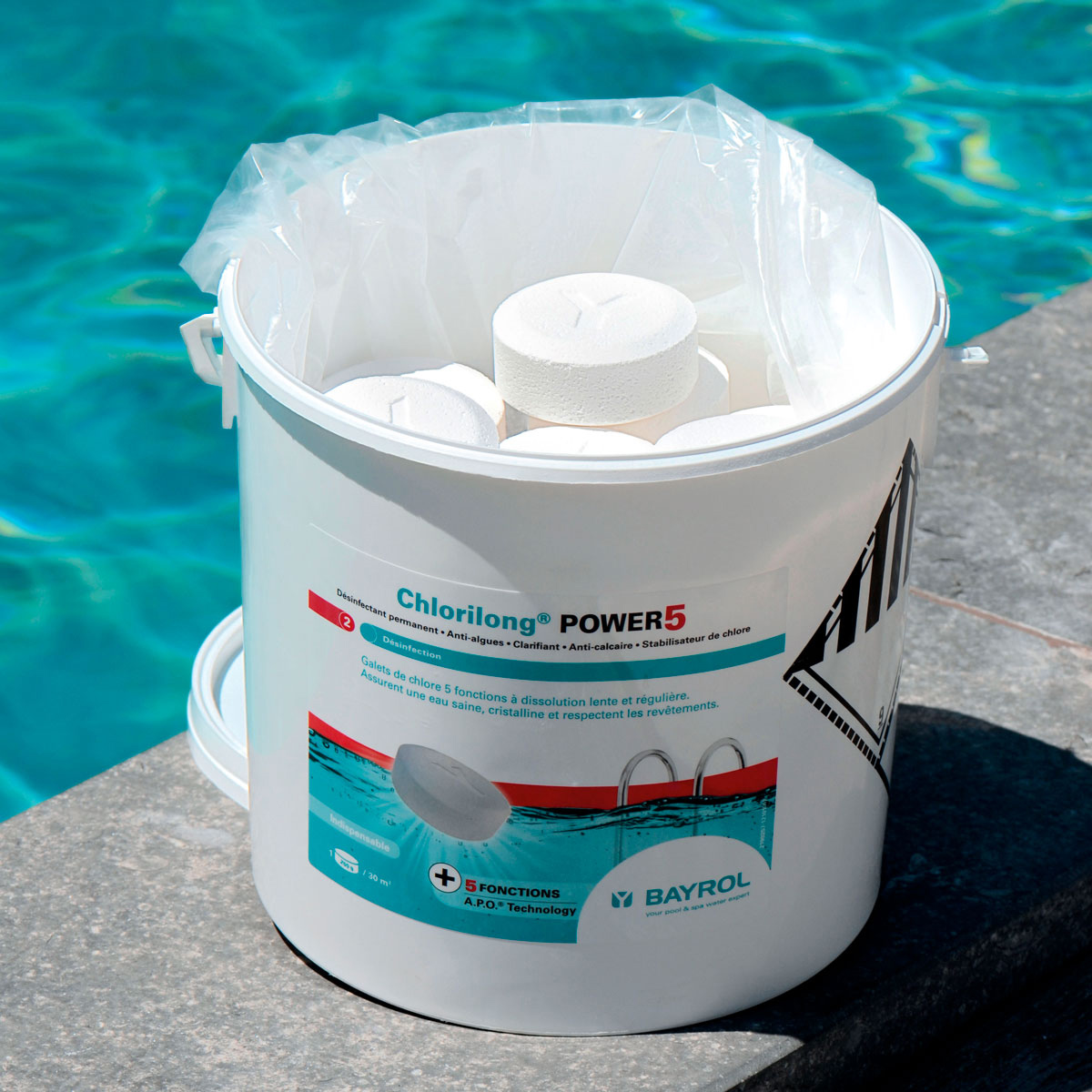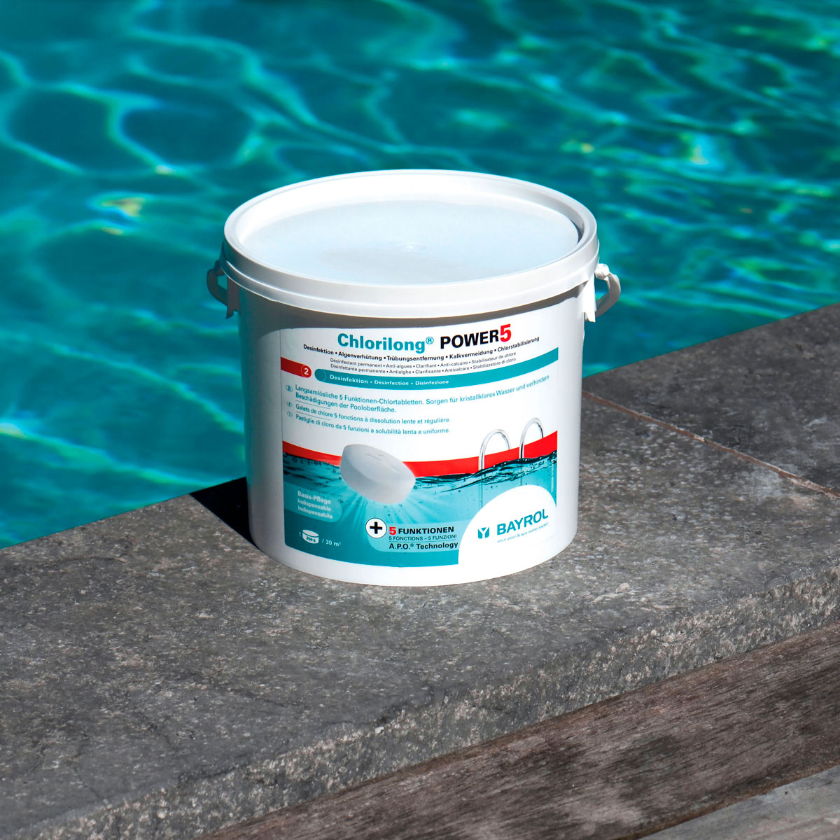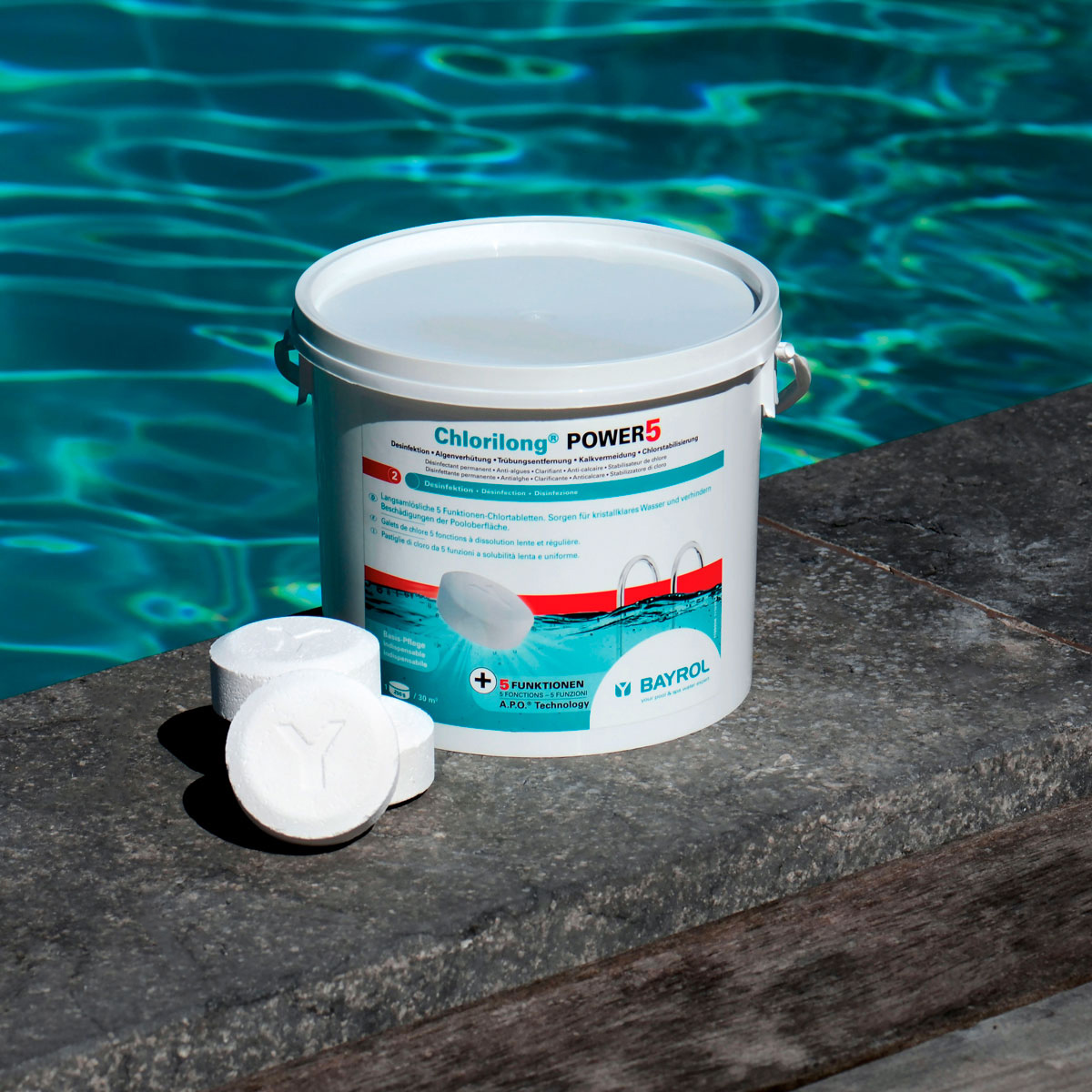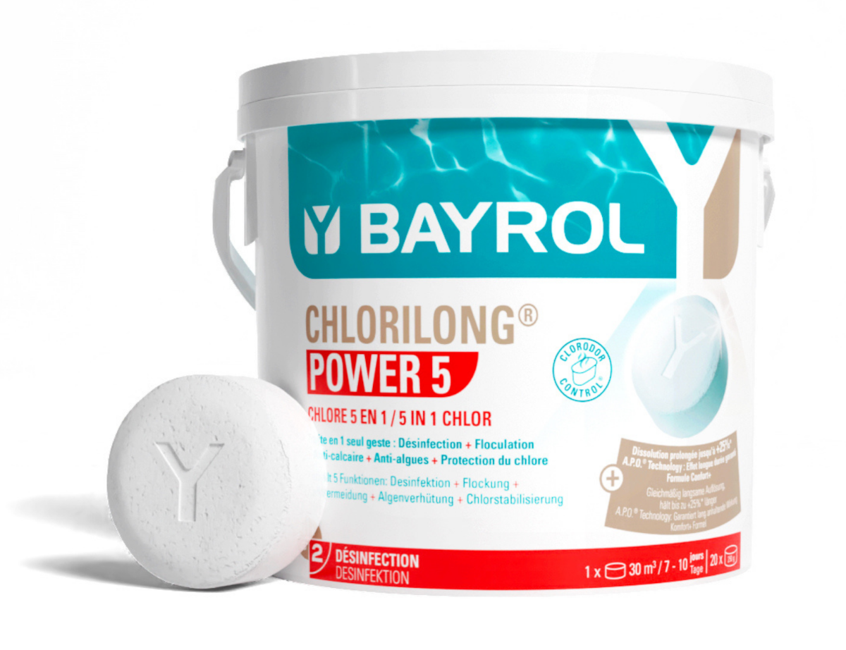 Chlorilong® POWER5 ist eine langsamlösliche 250g Chlortablette mit 5 Funktionen (Desinfektion • Algenverhütung • Trübungsentfernung • Kalkvermeidung • Chlorstabilisierung). Neben der Verwendung von hochwertigen Rohmaterialien wird bei der Pressung der Tabletten ein innovatives Verfahren angewendet: die A.P.O.®-Technologie. Diese stellt sicher, dass sich die Tablette sehr gleichmäßig auflöst und immer eine konstante Menge Chlor an das Wasser abgibt.