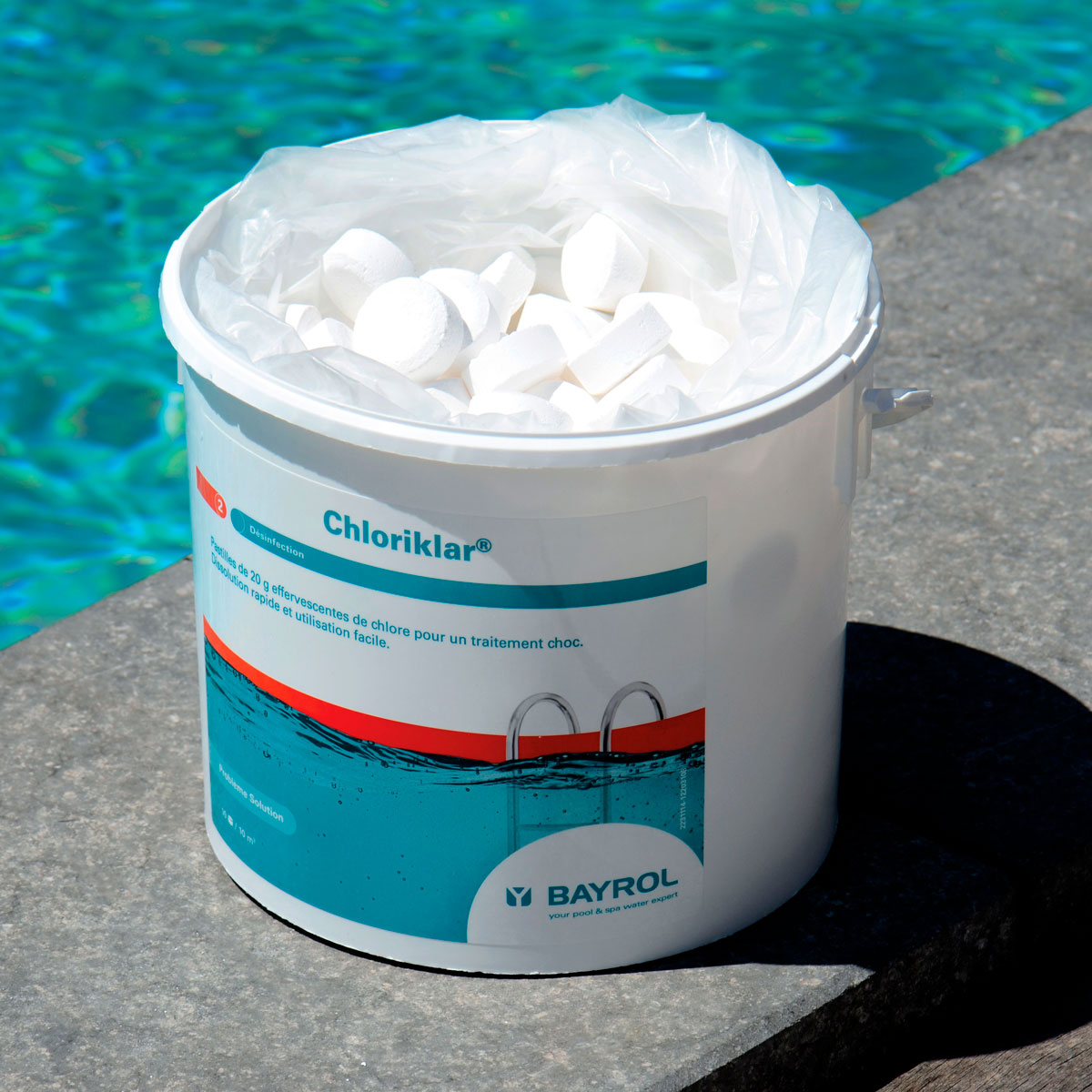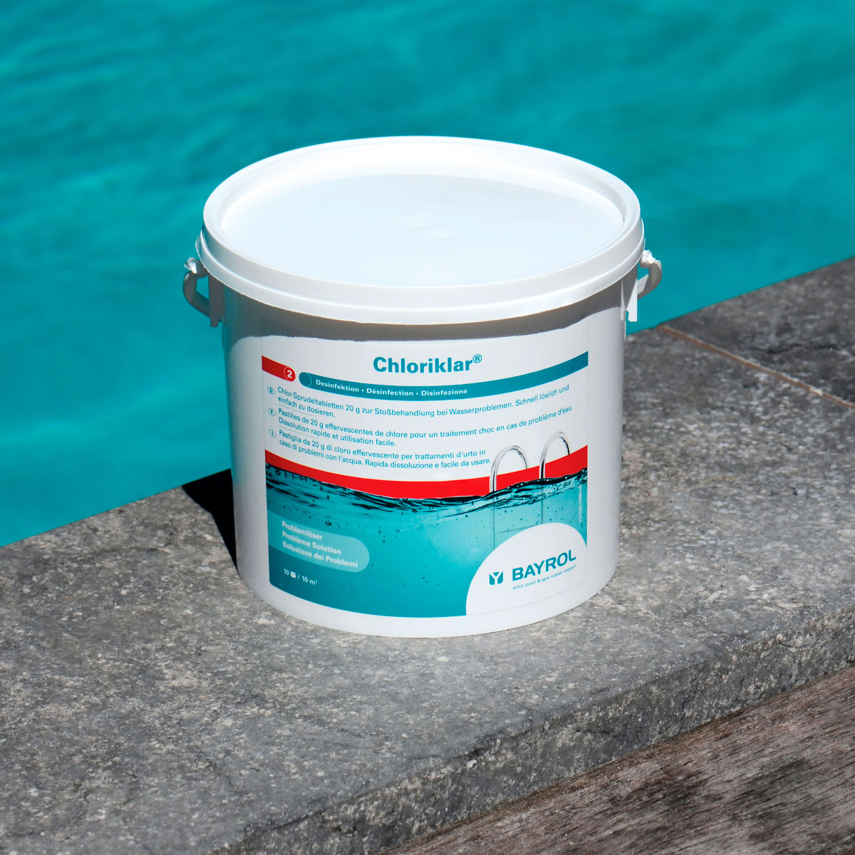 - Für eine Basischlorung dosieren Sie 2 Chloriklar®-Tabletten pro 10 m³.