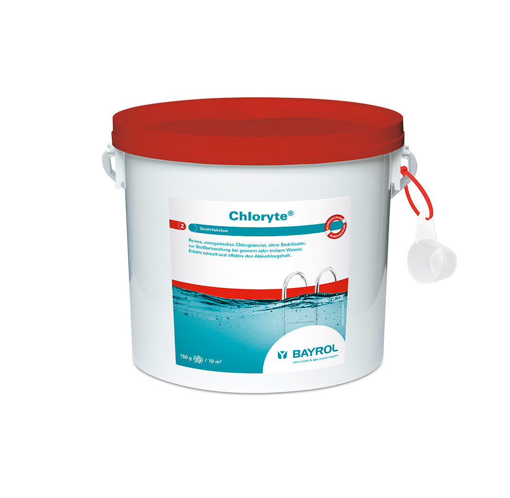 Chloryte® besteht aus anorganischem Chlorgranulat (Calciumhypochlorit) mit 70% Aktivchlorgehalt. Ideal für die Stoßbehandlung bei Problemen mit der Wasserpflege. Chloryte® wirkt sofort gegen Bakterien, Pilze und Algen. Durch die spezielle Granulatform entsteht weniger Staub.