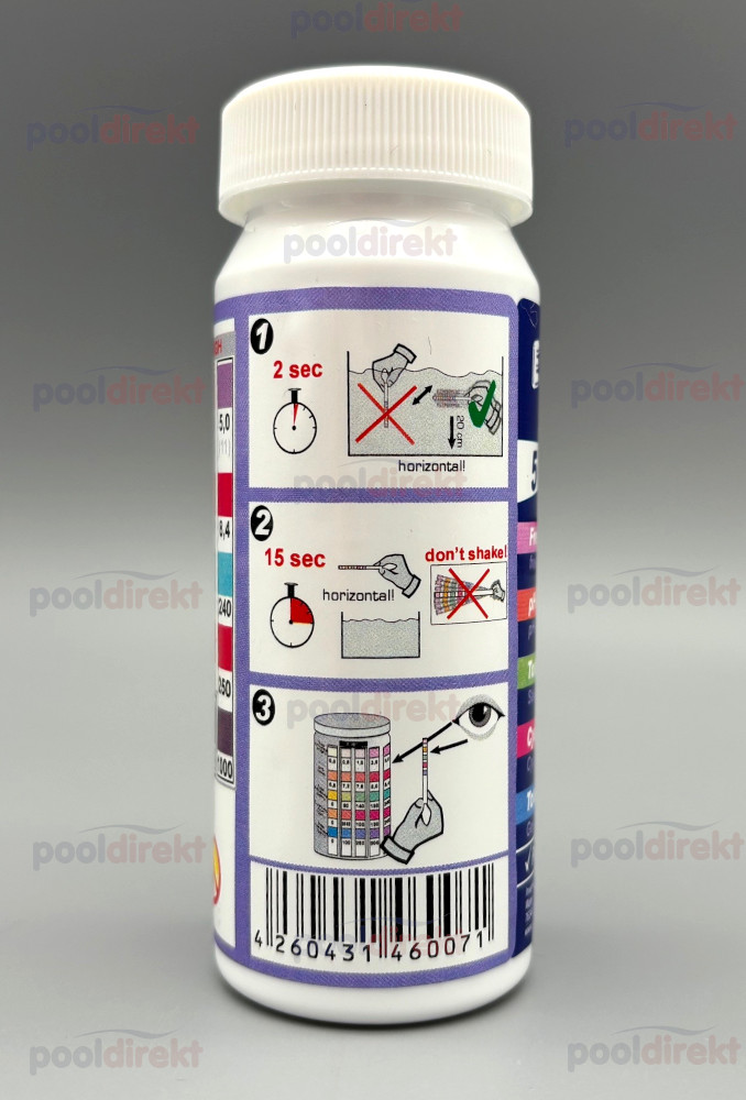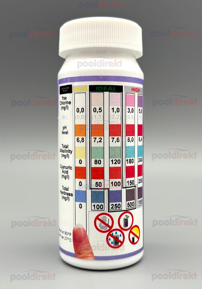Die CL & Br QUICKTEST 5-in-1 Teststreifen messen fünf wichtige Wasserwerte im Pool: freies Chlor oder Brom, pHWert, Alkalinität (TA), Gesamthärte (TH) und Chlorstabilisator (Cyanursäure).Die ermittelten Werte können ganz einfach in der My POOL Expert App eingegeben werden – für eine präzise und individuelle Wasseranalyse. 5 wichtige Wasserwerte mit nur einem Test Freies Chlor & Brom, pH-Wert, Alkalinität (TA), Gesamthärte (TH), Chlorstabilisator (CYA) Klare, präzise Farbskala für eine einfache Auswertung Ergebnisse in wenigen Sekunden 50 Teststreifen pro Dose Ideal in Kombination mit der My POOL Expert App Die Reaktionsfelder für Chlor und Brom verfärben sich unabhängig vom eingesetzten Desinfektionsmittel. Bitte werten Sie ausschließlich das Feld aus, das zur verwendeten Pflegemethode passt (Chlor oder Brom).Für zuverlässige Ergebnisse sollten alle gemessenen Werte innerhalb der Idealbereiche liegen – besonders der pH-Wert und der Stabilisator sind entscheidend für die Wirksamkeit der Wasserpflege. Anwendung: Den Teststreifen 5 Sek. im Wasser schwenken, anschließend herausnehmen. Den Flüssigkeitsüberschuss nicht abschütteln. pH-Wert und Chlorstabilisator (CYA) sofort anhand der Farbskala auf der Dose ablesen. Nach 10 Sekunden die Farbfelder für freies Chlor oder Brom (je nach Pflegemethode), Alkalinität (TA) und Gesamthärte (TH) vergleichen. Empfohlene Anwendung: Mindestens einmal wöchentlich messen – zusätzlich nach starkem Regen, Frischwasserzugabe oder bei sichtbaren Wasserproblemen.Für eine optimale und individuelle Auswertung nutzen Sie die My POOL Expert App. Inhalt: 50 Teststreifen Wichtig: Wasserteststreifen vor Sonnenlicht und Feuchtigkeit schützen. Dose kühl und trocken aufbewahren (Lagertemperatur nicht über +30 °C) und nach Entnahme der Teststreifen sofort wieder verschließen. Testfelder nicht mit den Fingern berühren.Bei sachgemäßer Lagerung sind die Teststreifen bis zum aufgedruckten Verfallsdatum haltbar. Darf nicht in die Hände von Kindern gelangen. Nicht einnehmen.