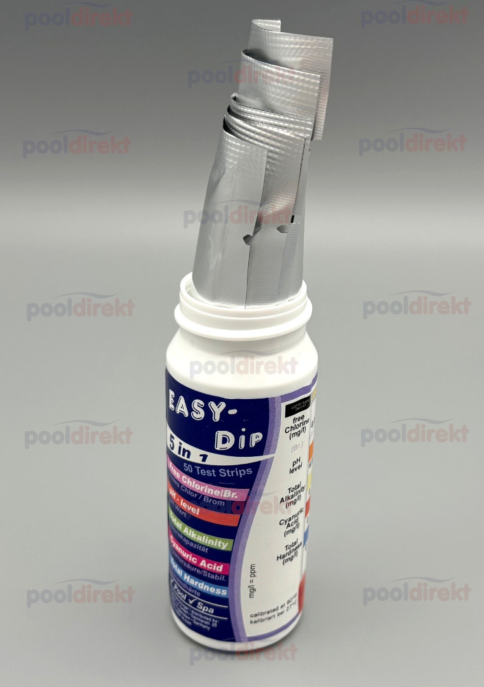 • Der Easy Dip Wasserteststreifen misst den Chlor-, pH- Wert und die Alkalinität, sowie Cyanursäure und Wasserhärte (gesamt).