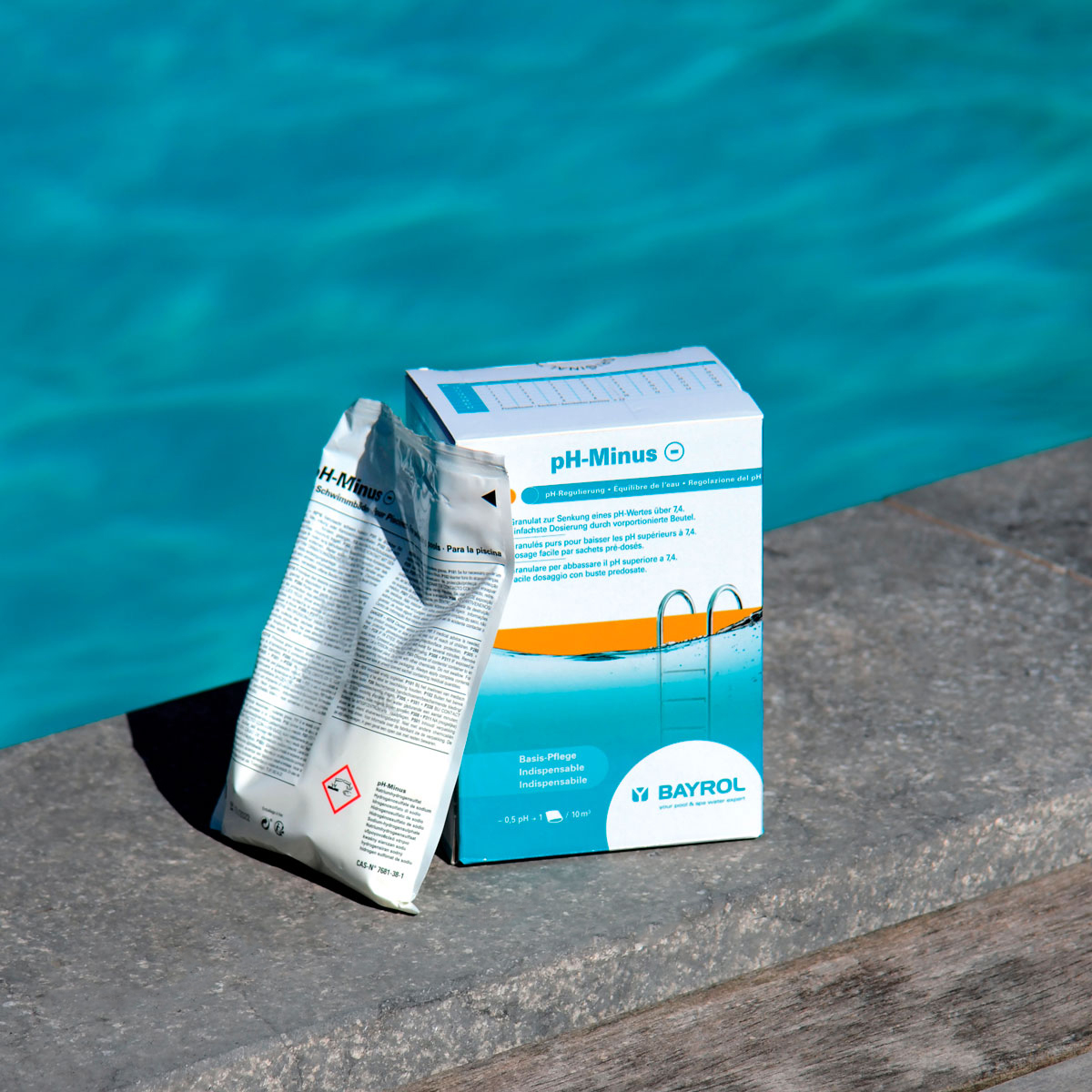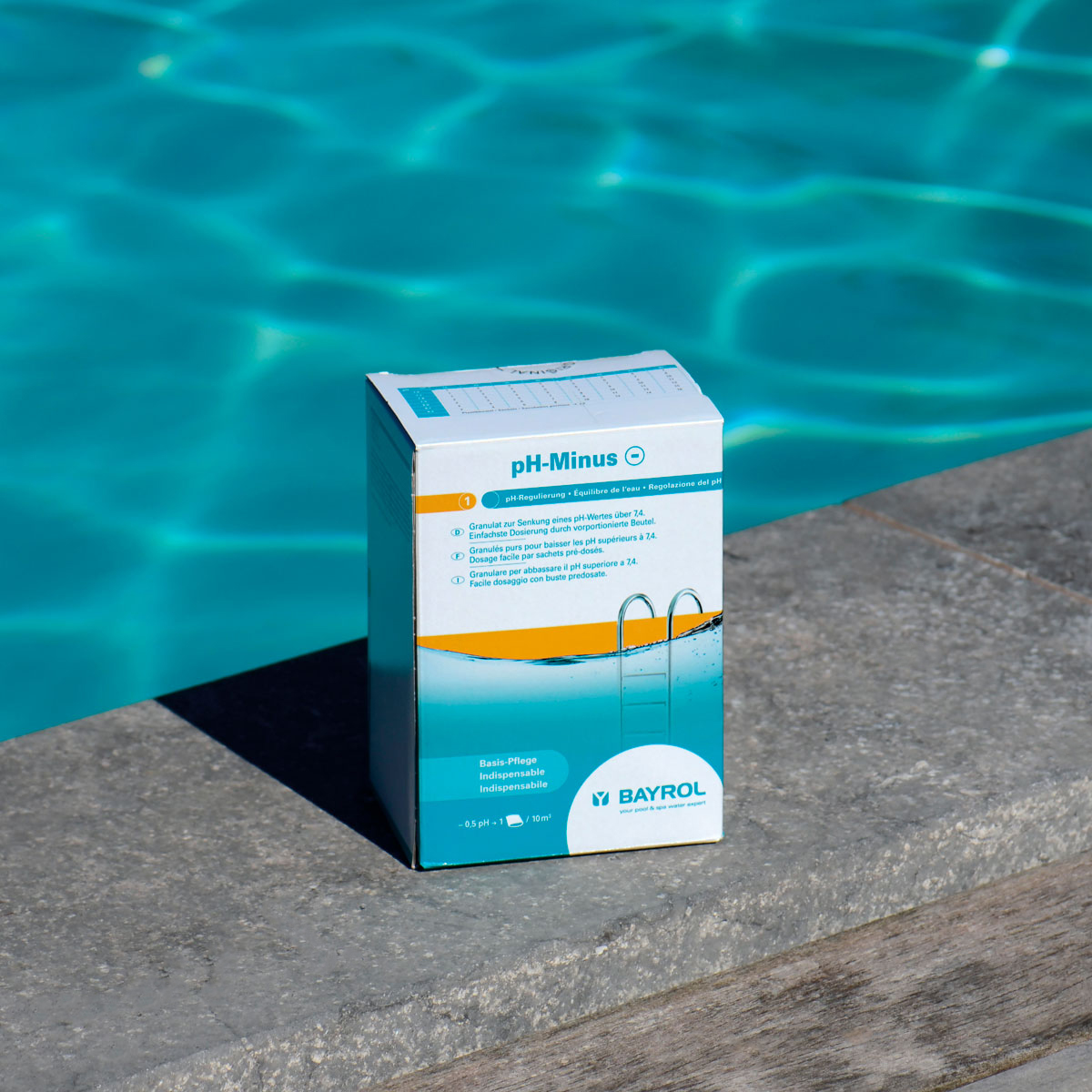 Tipp: Der pH-Wert ändert sich sofort nach der Auflösung des Pulvers. Überprüfen Sie daher zwischendurch die Senkung des pH-Wertes mit BAYROL-Teststreifen oder dem BAYROL-Pooltester.