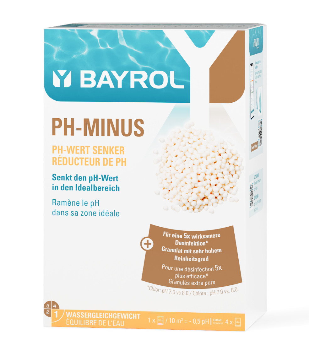 - Um den pH-Wert um 0,5 zu senken, ist ein Beutel pH-Minus (500 g) pro 10 m³ erforderlich.