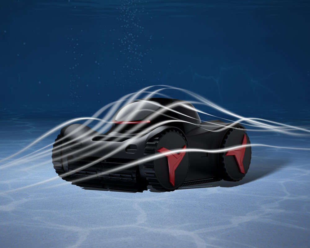 Die hydrodynamische Antriebsstruktur reduziert Turbulenzen und nutzt Restenergie für zusätzlichen Vortrieb. Zusammen mit dem Dual-Drive Total Coverage System, der Dual-Pumpen-Technologie und dem Turbo-Modus mit 200 % Leistung sorgt sie für vollständige, gleichmäßige Reinigung – selbst in extrem flachen Bereichen.